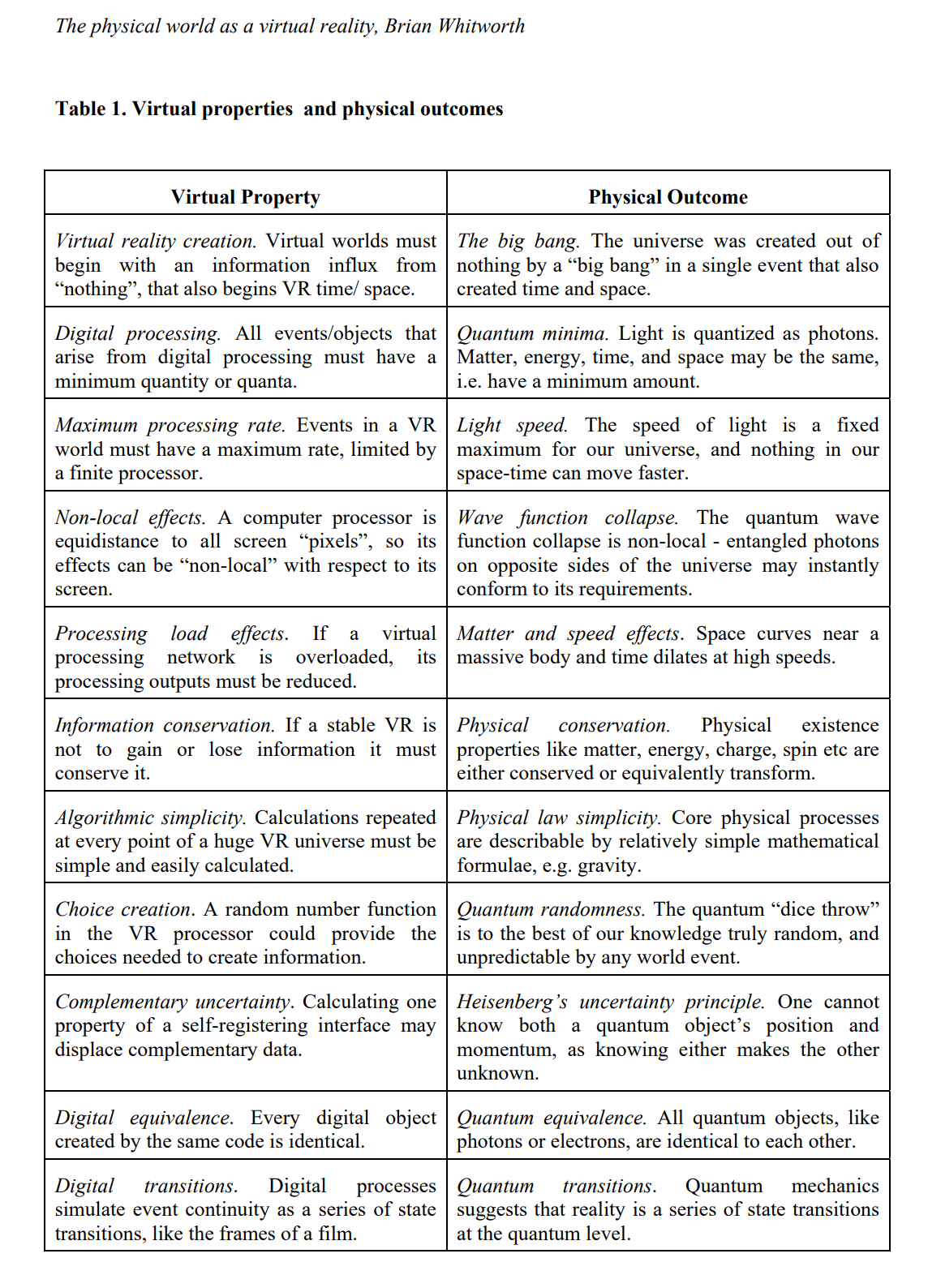 Here's one of my favorite tables from this paper. It shows the parallels between certain virtual properties and their physical counterparts in quantum physics and cosmology.